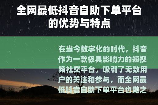 在当今数字化的时代,抖音作为一款极具影响力的短视频社交平台,吸引了无数用户的关注和参与,而全网最低抖音自助下单平台也随之应运而生,为众多抖音用户提供了一种独特的服务体验。