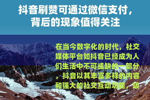 抖音刷赞通过微信支付的现象是一个值得我们深入思考和关注的社会现象,它涉及到平台、用户、社会等多个层面的问题,我们需要以积极的态度去面对和解决这些问题,共同营造一个更加健康、有序、充满活力的社交媒体生态环境,让抖音等平台在数字时代中绽放出更加耀眼的光芒,为人们的生活和社会的发展带来更多的惊喜和收获。