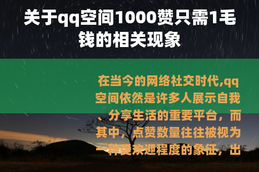 但不可否认的是,在当前的网络环境下,qq空间1000赞1毛钱的现象依然存在,并且有其一定的市场需求,对于用户来说,在享受这种刷赞服务带来的短暂满足感的同时,也应该保持一定的理性和自我认知,明白真正的社交价值不仅仅体现在点赞数量上,更在于真实的情感交流和有意义的内容分享,而对于社交平台而言,也需要不断加强管理和监督,规范用户行为,维护平台的健康生态,让qq空间能够真正成为一个充满真实、有价值社交互动的场所,让用户在其中能够获得真正的快乐和满足,而不是仅仅被虚假的点赞数字所迷惑,qq空间才能在不断变化的网络社交潮流中保持其独特的魅力和价值,继续为广大用户提供一个良好的社交平台,让用户在这里能够自由地展示自我、分享生活,与亲朋好友进行真诚的交流和互动,共同营造一个积极、健康、充满活力的网络社交环境。 你能满意,若你还有其他具体的修改意见或想法,欢迎随时告诉我。