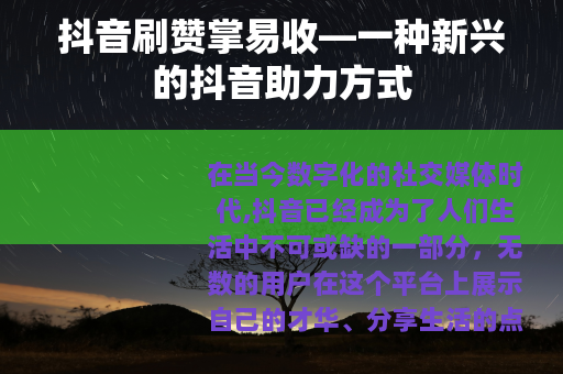 在当今数字化的社交媒体时代,抖音已经成为了人们生活中不可或缺的一部分,无数的用户在这个平台上展示自己的才华、分享生活的点滴,希望能够获得更多的关注和点赞,而在这个过程中,抖音刷赞掌易收逐渐走进了人们的视野。