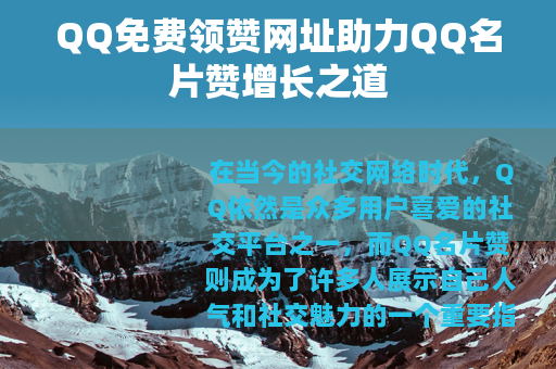 在当今的社交网络时代,QQ依然是众多用户喜爱的社交平台之一,而QQ名片赞则成为了许多人展示自己人气和社交魅力的一个重要指标,对于很多QQ用户来说,拥有大量的名片赞会让他们感到无比的自豪和满足,寻找QQ免费领赞网址便成为了不少人的追求。