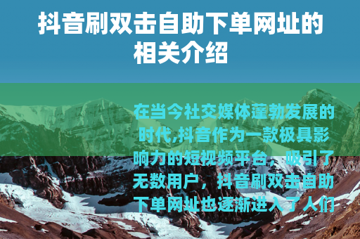 在当今社交媒体蓬勃发展的时代,抖音作为一款极具影响力的短视频平台,吸引了无数用户,抖音刷双击自助下单网址也逐渐进入了人们的视野。