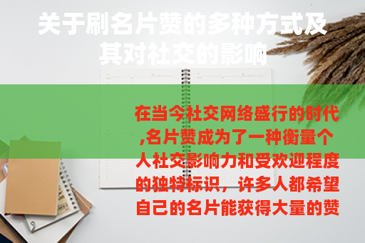 在当今社交网络盛行的时代,名片赞成为了一种衡量个人社交影响力和受欢迎程度的独特标识,许多人都希望自己的名片能获得大量的赞,从而在社交圈子中展现出较高的人气,刷名片赞也因此应运而生,成为了一个备受关注的现象。