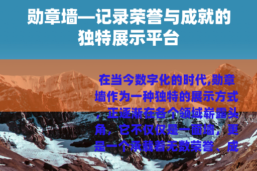 勋章墙在现代社会的各个领域都发挥着重要的作用,它是一种多维度、多功能的展示平台,具有丰富的内涵和价值,无论是对于个人的成长与发展,还是对于社会的进步与繁荣,勋章墙都有着不可替代的意义,我们应该积极探索和创新勋章墙的应用,让它在新时代焕发出更加耀眼的光芒,为我们的生活和社会增添更多的色彩和活力,在未来的日子里,随着社会的不断发展和科技的持续进步,勋章墙必将不断演变和完善,成为我们生活中一道更加亮丽的风景线,激励着一代又一代的人不断追求卓越,创造更加美好的未来。