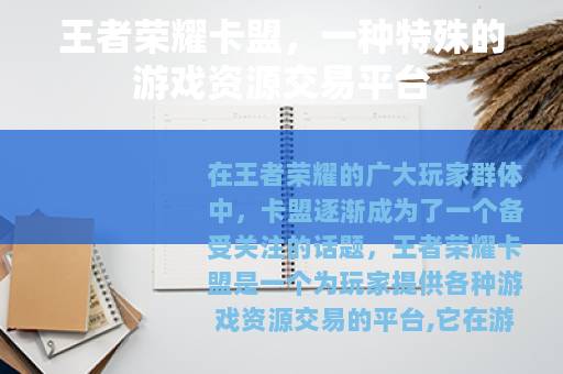 在王者荣耀的广大玩家群体中,卡盟逐渐成为了一个备受关注的话题,王者荣耀卡盟是一个为玩家提供各种游戏资源交易的平台,它在游戏世界中有着独特的地位和作用。