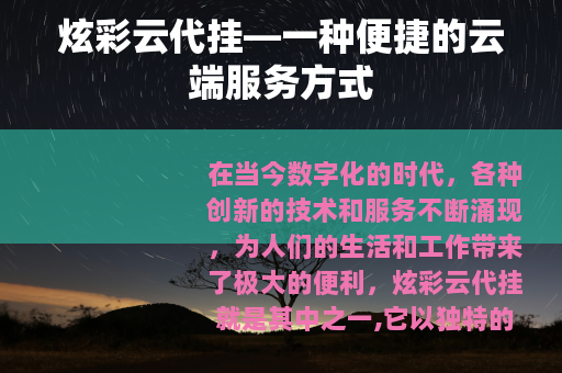 在当今数字化的时代,各种创新的技术和服务不断涌现,为人们的生活和工作带来了极大的便利,炫彩云代挂就是其中之一,它以独特的优势在众多云端服务中崭露头角。