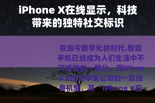 在当今数字化的时代,智能手机已经成为人们生活中不可或缺的一部分,而iPhone X作为苹果公司的一款经典机型,其“iPhone X在线”这一状态更是具有独特的意义和价值。