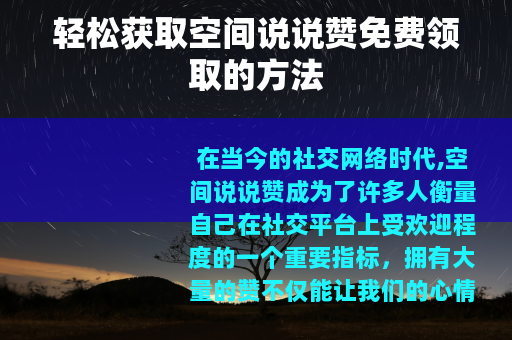 空间说说赞免费领取并不是一件难事,只要我们掌握了正确的方法和技巧,并且能够合理合法地去操作,就一定能够轻松实现自己的目标,让我们充分利用这些方法,在社交平台上展现自己的魅力,收获更多的快乐和友谊,希望大家都能通过免费领取空间说说赞,让自己的社交生活变得更加丰富多彩。