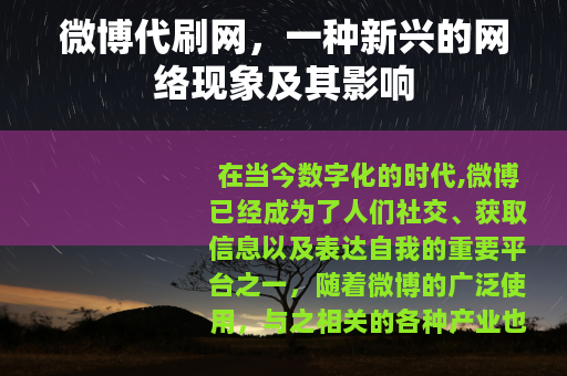 在当今数字化的时代,微博已经成为了人们社交、获取信息以及表达自我的重要平台之一,随着微博的广泛使用,与之相关的各种产业也应运而生,其中微博代刷网就是一个备受关注的领域。