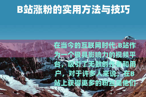在当今的互联网时代,B站作为一个极具影响力的视频平台,吸引了无数创作者和用户,对于许多人来说,在B站上获得更多的粉丝是他们努力的目标之一,如何在B站实现涨粉呢?以下是一些实用的方法和技巧。 质量是关键,要确保你的视频内容有深度、有趣味、有价值,无论是知识科普、搞笑娱乐还是生活记录等各种类型,都要做到专业且独特,精心策划视频的主题和情节,让观众在观看过程中能够产生共鸣和兴趣,从而愿意关注你的账号,期待你更多的作品。