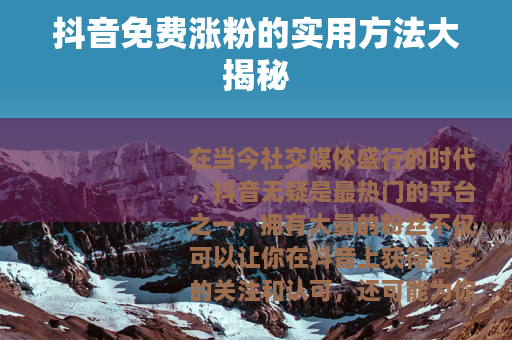 在当今社交媒体盛行的时代,抖音无疑是最热门的平台之一,拥有大量的粉丝不仅可以让你在抖音上获得更多的关注和认可,还可能为你带来各种商业机会,抖音怎么样免费涨粉呢?下面就为大家详细介绍一些有效的方法。