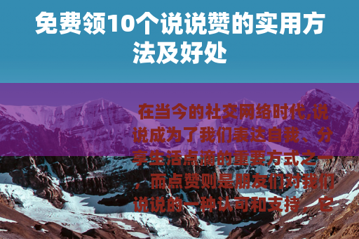 在当今的社交网络时代,说说成为了我们表达自我、分享生活点滴的重要方式之一,而点赞则是朋友们对我们说说的一种认可和支持,它能让我们感受到被关注和喜爱,就来给大家介绍一种可以免费领10个说说赞的途径及其相关好处。
