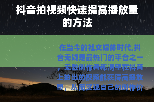 通过以上这些方法的综合运用,你在抖音拍视频时就有更大的可能快速提高播放量,在抖音这个充满机遇的平台上收获更多的关注和认可,不断学习和实践,根据数据反馈及时调整自己的创作策略,持续优化视频内容和表现形式,相信你在抖音上的创作之路会越来越顺利,播放量也会不断攀升。