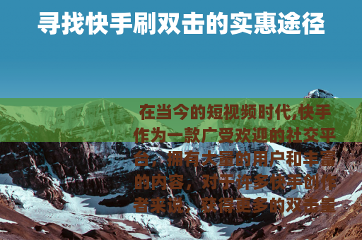 寻找快手刷双击买最便宜的方法需要我们多花时间和精力去探索和比较,在保证账号安全和服务质量的前提下,找到最适合自己的方案。