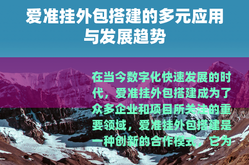 在当今数字化快速发展的时代,爱准挂外包搭建成为了众多企业和项目所关注的重要领域,爱准挂外包搭建是一种创新的合作模式,它为企业提供了一种高效、灵活且具有成本效益的解决方案,助力企业在激烈的市场竞争中脱颖而出。