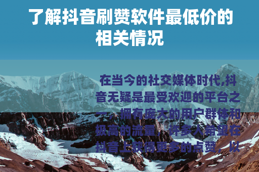 在当今的社交媒体时代,抖音无疑是最受欢迎的平台之一,拥有庞大的用户群体和极高的流量,许多人希望在抖音上获得更多的点赞,以增加自己作品的曝光度和影响力,于是抖音刷赞软件便应运而生,其中最低价的刷赞软件更是受到了不少人的关注。