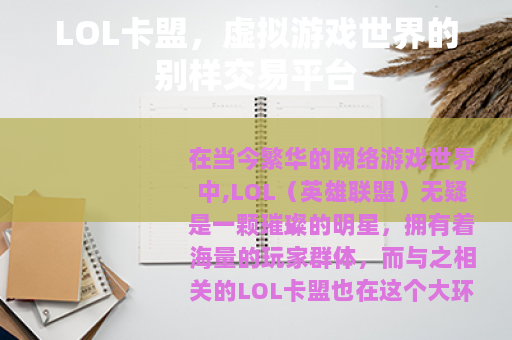 在当今繁华的网络游戏世界中,LOL(英雄联盟)无疑是一颗璀璨的明星,拥有着海量的玩家群体,而与之相关的LOL卡盟也在这个大环境下应运而生,成为了游戏玩家们关注的一个独特领域。