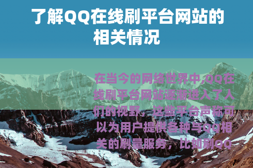 在当今的网络世界中,QQ在线刷平台网站逐渐进入了人们的视野,这些平台声称可以为用户提供各种与QQ相关的刷量服务,比如刷QQ空间的访问量、点赞数、评论数,刷QQ等级,甚至是刷QQ好友数量等。