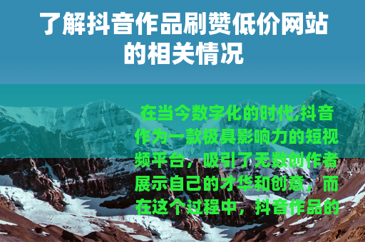 在当今数字化的时代,抖音作为一款极具影响力的短视频平台,吸引了无数创作者展示自己的才华和创意,而在这个过程中,抖音作品的点赞数量成为了衡量其受欢迎程度的一个重要指标,抖音作品刷赞低价网站便应运而生,引起了不少人的关注。