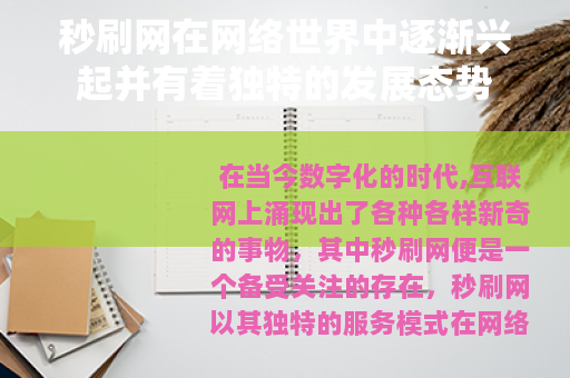 在当今数字化的时代,互联网上涌现出了各种各样新奇的事物,其中秒刷网便是一个备受关注的存在,秒刷网以其独特的服务模式在网络的众多平台中占据了一席之地。