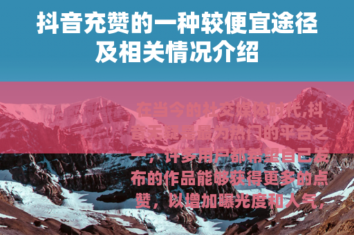 在当今的社交媒体时代,抖音无疑是最为热门的平台之一,许多用户都希望自己发布的作品能够获得更多的点赞,以增加曝光度和人气,而在这个过程中,抖音充赞便宜的方式也逐渐受到了一些人的关注。