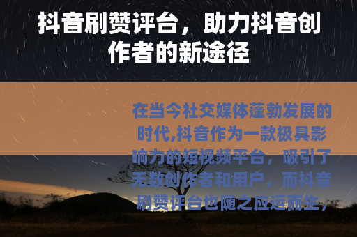 在当今社交媒体蓬勃发展的时代,抖音作为一款极具影响力的短视频平台,吸引了无数创作者和用户,而抖音刷赞评台也随之应运而生,为众多抖音创作者提供了一种新的发展助力。