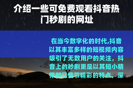 在当今数字化的时代,抖音以其丰富多样的短视频内容吸引了无数用户的关注,抖音上的秒剧更是以其短小精悍却又情节精彩的特点,深受广大观众喜爱,许多人在闲暇之余都希望能找到一些可以免费观看这些精彩秒剧的网址,以便能更方便地享受这些有趣的视频内容。