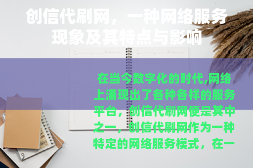 在当今数字化的时代,网络上涌现出了各种各样的服务平台,创信代刷网便是其中之一,创信代刷网作为一种特定的网络服务模式,在一定程度上满足了部分用户在网络活动中的特定需求。