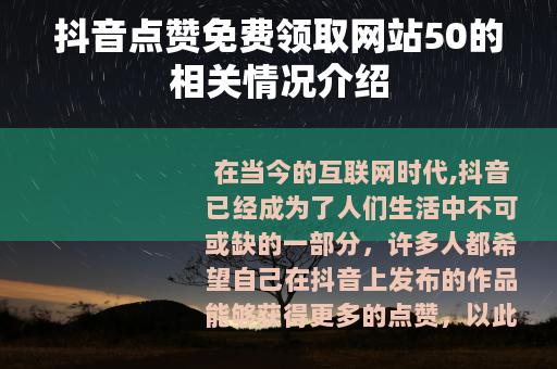 在当今的互联网时代,抖音已经成为了人们生活中不可或缺的一部分,许多人都希望自己在抖音上发布的作品能够获得更多的点赞,以此来增加作品的热度和影响力,而“抖音点赞免费领取网站50”这样的信息也随之在网络上出现。