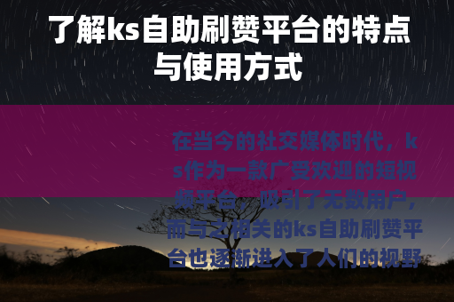 在当今的社交媒体时代,ks作为一款广受欢迎的短视频平台,吸引了无数用户,而与之相关的ks自助刷赞平台也逐渐进入了人们的视野。