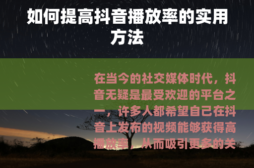 在当今的社交媒体时代,抖音无疑是最受欢迎的平台之一,许多人都希望自己在抖音上发布的视频能够获得高播放率,从而吸引更多的关注和粉丝,怎么才能提高抖音的播放率呢?以下是一些实用的方法。 是关键,要确保你的视频内容具有吸引力和独特性,可以从热门话题中寻找灵感,但要加入自己的创意和风格,让观众在众多类似的视频中能够眼前一亮,如果你擅长烹饪,那么可以制作一些独特的美食制作视频,展示一些新颖的食谱或者独特的烹饪技巧,这样能够吸引美食爱好者的关注。