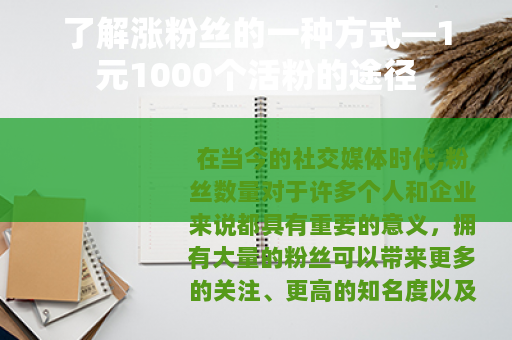 在当今的社交媒体时代,粉丝数量对于许多个人和企业来说都具有重要的意义,拥有大量的粉丝可以带来更多的关注、更高的知名度以及更多的商业机会,而在众多的涨粉方法中,有一种方式声称可以以1元1000个活粉的价格帮助人们快速增加粉丝数量。
