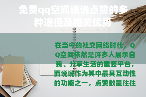 在当今的社交网络时代,QQ空间依然是许多人展示自我、分享生活的重要平台,而说说作为其中最具互动性的功能之一,点赞数量往往成为了衡量其受欢迎程度和影响力的一个重要指标,免费QQ空间说说点赞便成为了很多用户关注的焦点,下面就来为大家介绍一些关于免费QQ空间说说点赞的情况。