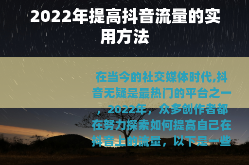 在2022年要提高抖音流量,需要从内容创作、制作质量、功能利用、标题封面以及发布频率等多个方面入手,不断优化和改进自己的运营策略,才能在竞争激烈的抖音平台上获得更多的关注和流量。