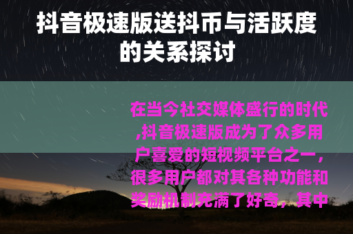 在当今社交媒体盛行的时代,抖音极速版成为了众多用户喜爱的短视频平台之一,很多用户都对其各种功能和奖励机制充满了好奇,其中一个常见的问题就是:抖音极速版送抖币能提高活跃度吗?
