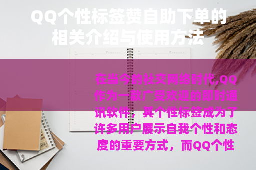 在当今的社交网络时代,QQ作为一款广受欢迎的即时通讯软件,其个性标签成为了许多用户展示自我个性和态度的重要方式,而QQ个性标签赞自助下单服务也随之兴起,为用户提供了一种快速增加标签赞数量的途径。