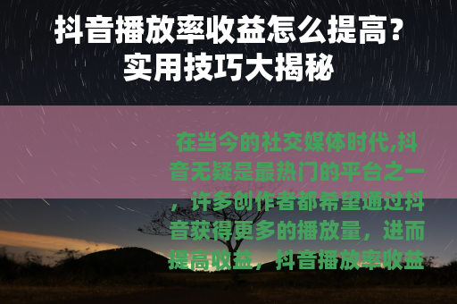在当今的社交媒体时代,抖音无疑是最热门的平台之一,许多创作者都希望通过抖音获得更多的播放量,进而提高收益,抖音播放率收益究竟该如何提高呢?本文将为你详细介绍一些实用的方法和技巧。