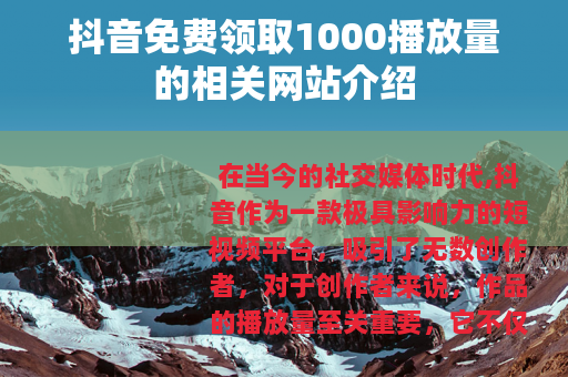 在当今的社交媒体时代,抖音作为一款极具影响力的短视频平台,吸引了无数创作者,对于创作者来说,作品的播放量至关重要,它不仅关系到作品的热度,还可能影响到后续的发展和收益,很多人都在寻找能够提升播放量的方法,而抖音免费领取1000播放量的网站也应运而生。