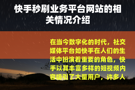 在当今数字化的时代,社交媒体平台如快手在人们的生活中扮演着重要的角色,快手以其丰富多样的短视频内容吸引了大量用户,许多人在这个平台上展示自己的才华、分享生活点滴,同时也通过各种方式努力提升自己在平台上的影响力和关注度,而在这个过程中,出现了一些所谓的快手秒刷业务平台网站。