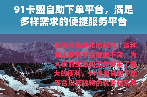 在当今数字化的时代,各种线上服务平台层出不穷,为人们的生活和工作带来了极大的便利,91卡盟自助下单平台以其独特的优势在众多平台中脱颖而出,成为了众多用户的首选。