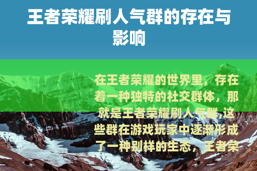 我们也应该看到,王者荣耀刷人气群在发展过程中也存在一些问题,有些玩家可能会过于依赖刷人气来获得满足感,而忽略了通过自身真正的游戏实力和努力去赢得他人的认可,还有些群里可能会出现一些不和谐的声音,比如争吵、诋毁等,影响了群内的氛围和玩家的体验。