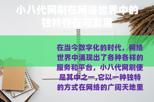 在当今数字化的时代,网络世界中涌现出了各种各样的服务和平台,小八代网刷便是其中之一,它以一种独特的方式在网络的广阔天地里找到了自己的生存空间。