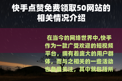 在当今的网络世界中,快手作为一款广受欢迎的短视频平台,拥有着庞大的用户群体,而与之相关的一些活动也备受关注,其中就包括所谓的快手点赞免费领取50的网站。