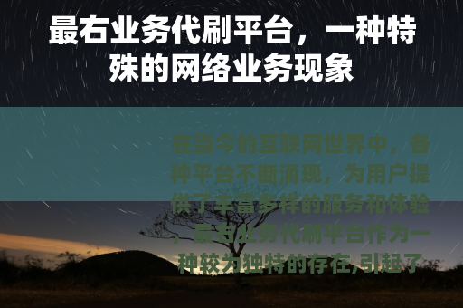 在当今的互联网世界中,各种平台不断涌现,为用户提供了丰富多样的服务和体验,最右业务代刷平台作为一种较为独特的存在,引起了不少人的关注。