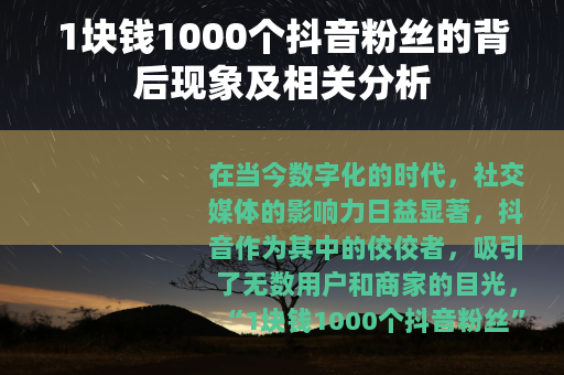 在当今数字化的时代,社交媒体的影响力日益显著,抖音作为其中的佼佼者,吸引了无数用户和商家的目光。“1块钱1000个抖音粉丝”这样的现象逐渐进入了大众的视野,引发了诸多讨论和思考。