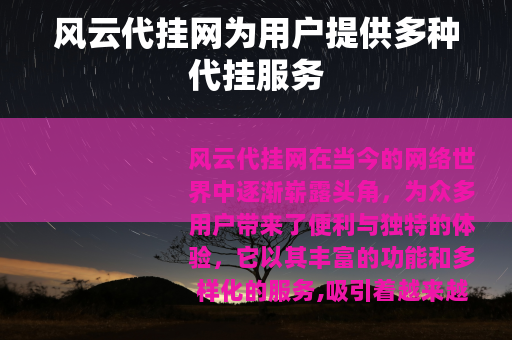 风云代挂网在当今的网络世界中逐渐崭露头角,为众多用户带来了便利与独特的体验,它以其丰富的功能和多样化的服务,吸引着越来越多的目光。