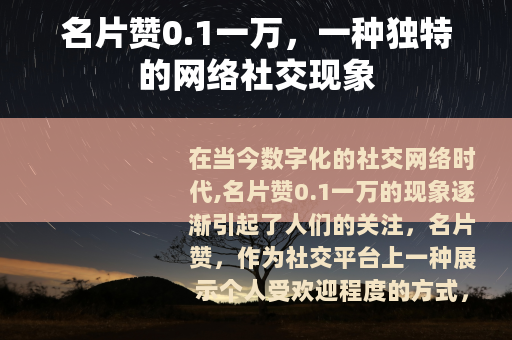 在未来,随着科技的不断发展和社交需求的不断变化,名片赞0.1一万的现象可能会继续存在并不断演变,也许会有更多的创新服务和模式出现,为用户提供更加丰富多样的社交体验,但无论如何,我们都应该以一种积极的心态去面对和适应这些变化,让社交网络更好地服务于我们的生活和社会交往,让名片赞0.1一万在合理的范围内发挥其应有的作用,为我们的社交世界带来更多的活力和可能性。