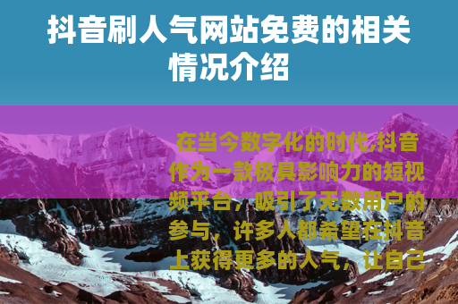 在当今数字化的时代,抖音作为一款极具影响力的短视频平台,吸引了无数用户的参与,许多人都希望在抖音上获得更多的人气,让自己的作品被更多人看到,从而实现各种目标,如增加知名度、推广产品或服务等,而抖音刷人气网站免费这一现象也随之出现并受到了一定的关注。