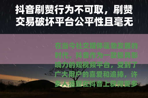 远离刷赞行为,坚持走正道,用自己的实力和努力在抖音上书写属于自己的精彩篇章,才是每一个抖音用户应该追求的正确方向,让我们共同努力,为抖音平台的健康发展贡献自己的一份力量,让这个平台变得更加美好,为更多的人带来快乐和价值。