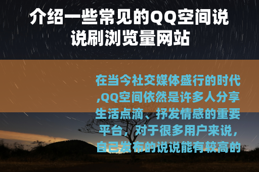 在当今社交媒体盛行的时代,QQ空间依然是许多人分享生活点滴、抒发情感的重要平台,对于很多用户来说,自己发布的说说能有较高的浏览量是一件令人开心的事情,这也促使了一些QQ空间说说刷浏览量网站的出现。